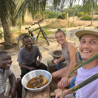 Vom Bananenkuchen packen wir etwas für den Besuch von Barnabas Familie ein. Dafür gehen wir an die Hauptstraße und warten auf ein Troo Troo (alte Kastenwagen, die hier den öffentlichen Verkehr darstellen). Wenn eins kommt hupen sie, halten die Hand raus und laden einen ein einzusteigen. In die Größe eines VW Busses passen hier ca. 17 Leute, manchmal noch zwei Gasflaschen in den halb offenen Kofferraum und etwas Holz aufs Dach. Die Fahrt kostet für eine halbe Stunde ca. 12 Cedi, umgerechnet etwa 80 Cent. Danach werden wir zu zweit auf einem Motorrad zu Barnabas Haus gebracht. Wir nennen dem Fahrer seinen Namen und er weiß sofort Bescheid, wohin es geht. Man kennt sich hier im Dorf. Er hat ein verhältnismäßig großes Haus mit 2-3 Räumen in denen 3 Erwachsene und 3 Kinder leben. Eine richtige Ordnung bei den Klamotten, Küchenutensilien und Geräten können wir nicht erkennen, aber sie haben sicher ihr eigenes System. Draußen hüpfen Ziegen und Hühner frei rum, die teilweise zum Nachbarn gehören. Die Meisten haben eine kleine Farm in der Nähe des Dorfes und versorgen sich mit eigenen Grundnahrungsmitteln, wie Kochbananen und Casava Wurzeln. Wir sitzen mit Barnabas zusammen und die Frauen kochen und versorgen uns. Es fühlt sich komisch für uns an, so bedient zu werden und nicht mithelfen zu dürfen und das die Frauen nicht mit uns zusammen essen. Seine Kids Chantal, Emanuela und Grace sind total süß und fahren zu dritt auf einem Fahrrad. Chanti ist erst zwei Jahre alt und wir sind die ersten weißen Menschen, die sie sieht. Sie wirkt entsprechend verwundert, aber auf unserem Schoß bleibt sie entspannt sitzen. Seine Frau bringt die große Schale mit dem Kloß in der Suppe mit etwas Fisch, Fleisch und Pilzen raus. Wir waschen uns die rechte Hand und essen gemeinsam das leckere Gericht aus einer großen Schüssel. Danach klettert einer der Nachbarjungs auf die Palme und wirft uns eine Kokosnuss runter. Ich darf mich das erste Mal an einer Machete ausprobieren. Wir genießen es sehr so herzlich eingeladen zu werden und einen so persönlichen Einblick in das Leben hier zu bekommen. Wir teilen den Bananenkuchen, bedanken uns und laufen durch das Dorf zurück zur Hauptstraße.
